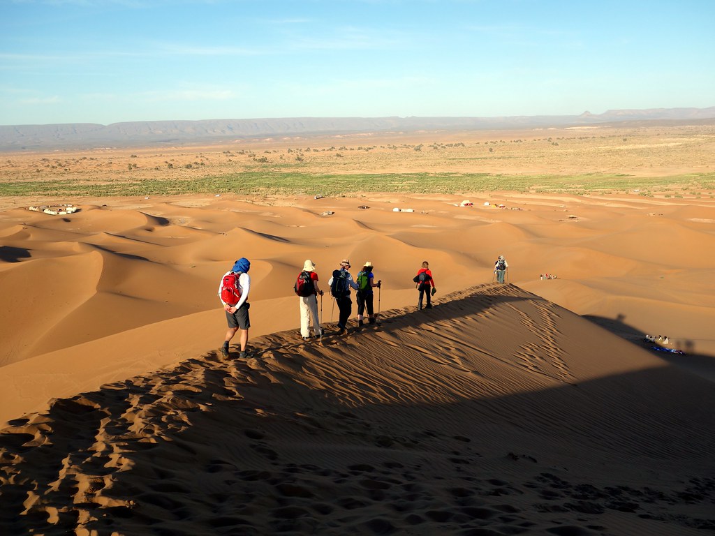 Early morning we have our breatfast and start loading of portable camp on the back of camel, to the rhythm of the sun, the camp folds up. And the departure through the dunes to find easy paths avoiding the blockage made by bigger sand dunes, then a vast dried-up lake and scrubs areas. all over the way there with open views and you will learn how the desert change from one area to another and how nomads learned its secret ways until to reach the magnificent dunes of the erg Zahar (called “screaming dunes”). Night in the Sahara desert in a tent, or under the stars. erg zahar is dunes number on the sahara of morocco due to its natural setting with no fixed camps or mass desert tourism, it is known for trekker as highlight destination, it is special place with orange dunes, lunch will be eaten after the set of camp on your nomadic tents.
