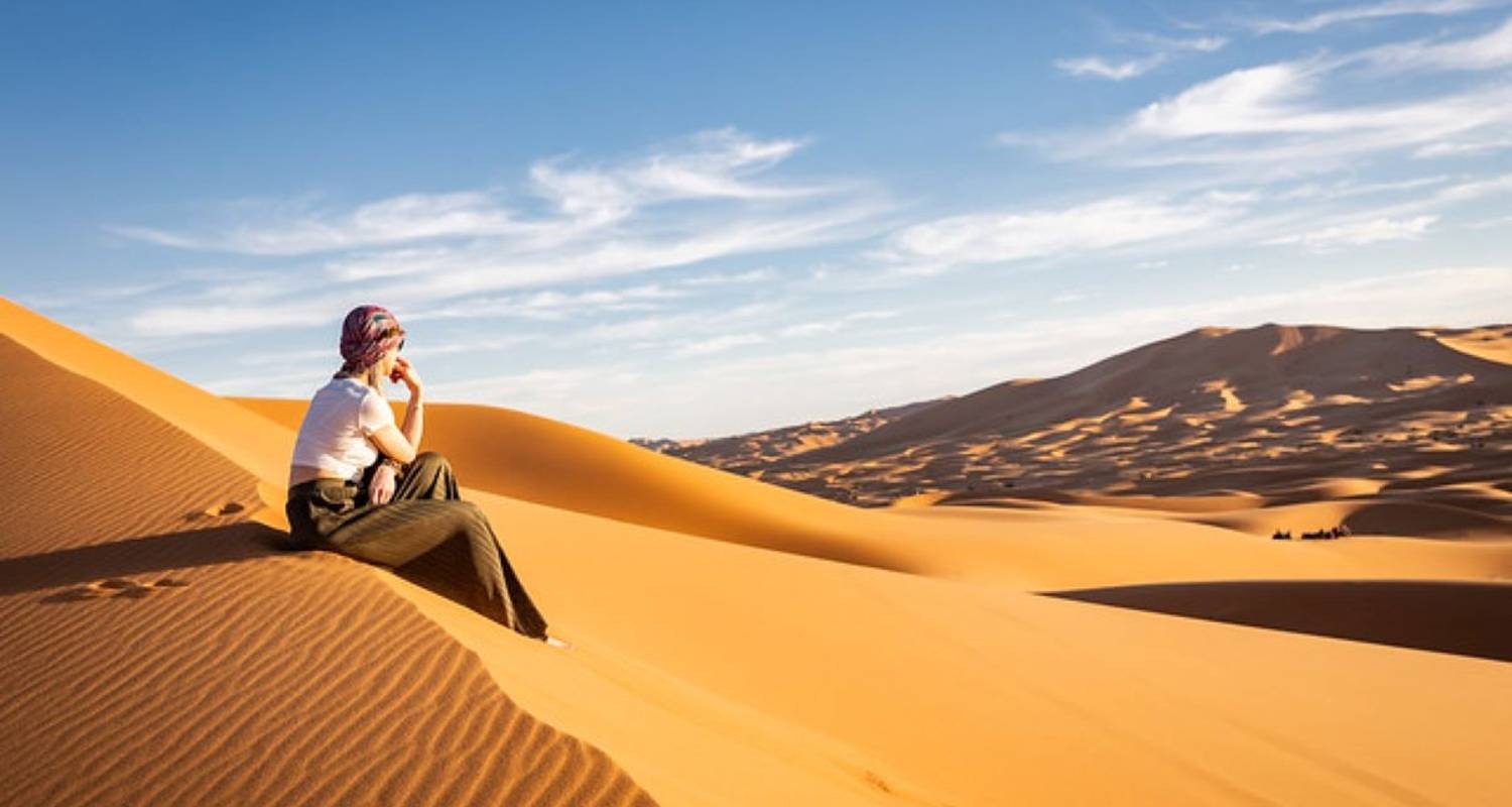 Travel through the Middle Atlas Mountains via Ifrane (known as Morocco’s “Little Switzerland”) and cedar forests of Azrou. Lunch in Midelt, then continue to Merzouga for a sunset camel trek and a magical night in a Luxury Sahara Camp with live Berber music.